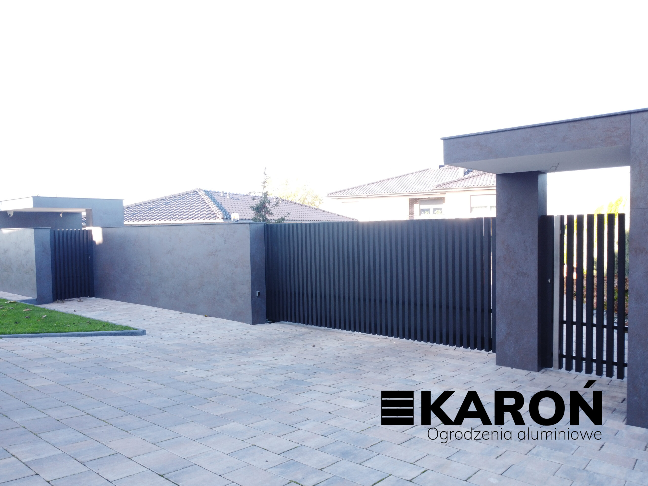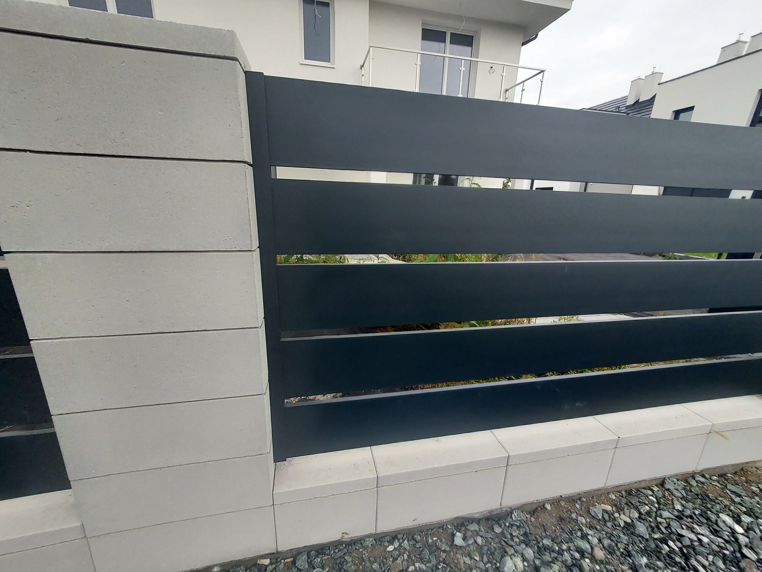 To nowoczesne rozwiązanie o charakterystycznym układzie pionowych profili „wyrastających” bezpośrednio z podmurówki, bez konieczności stosowania stężenia górnego (poprzeczki). Taka konstrukcja zapewnia minimalistyczny, prestiżowy wygląd oraz wysoki poziom prywatności, idealnie wpisując się w architekturę luksusowych willi i nowoczesnych domów jednorodzinnych we Wrocławiu.